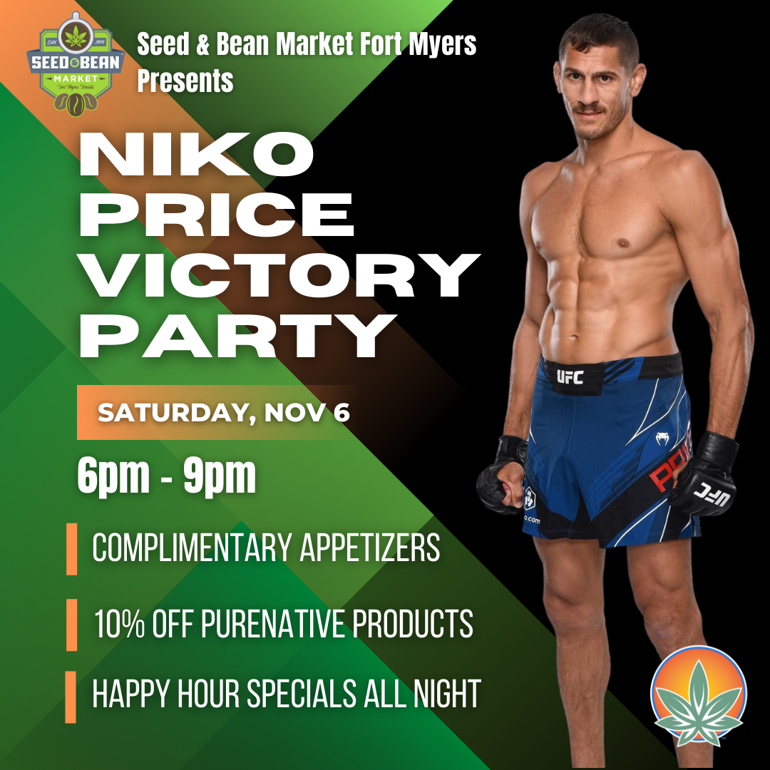 To celebrate UFC Fighter and PureNative Ambassador Niko “The Hybrid” Price’s recent victory. There will be free appetizers, happy hour specials all night, and discounts on PureNative products.